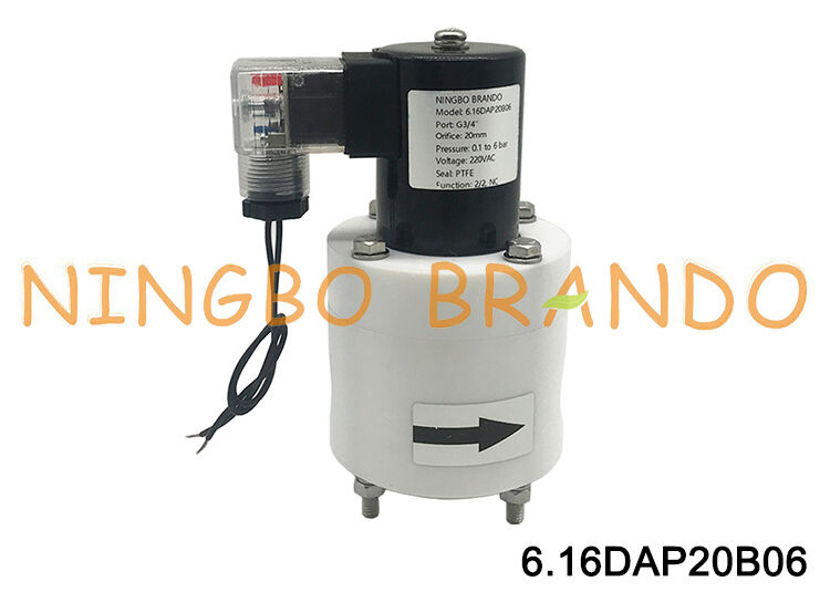 This is an anti corrosive PTFE solenoid valve, 3/4'' female threaded port size, 20mm orifice size, 2/2 way normally closed, pilot piston operated, 0.01 to 0.6 MPa working pressure, can be EPDM, FKM or PTFE seal to suit different working mediums, various voltages for your choice, such as 12VDC, 24VDC, 24VAC, 110VAC and 220VAC, etc. It is used for a wide arrange of industrial applications to control fluids.